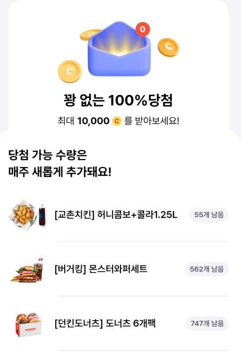 C를 써서 꽝 없는 쿠폰에 응모할 수도 있습니다. 이것을 통해 치킨이나 햄버거 쿠폰을 받을 수도 있습니다. 수량이 넉넉하니 나도 하나쯤은 되지 않을까요?
