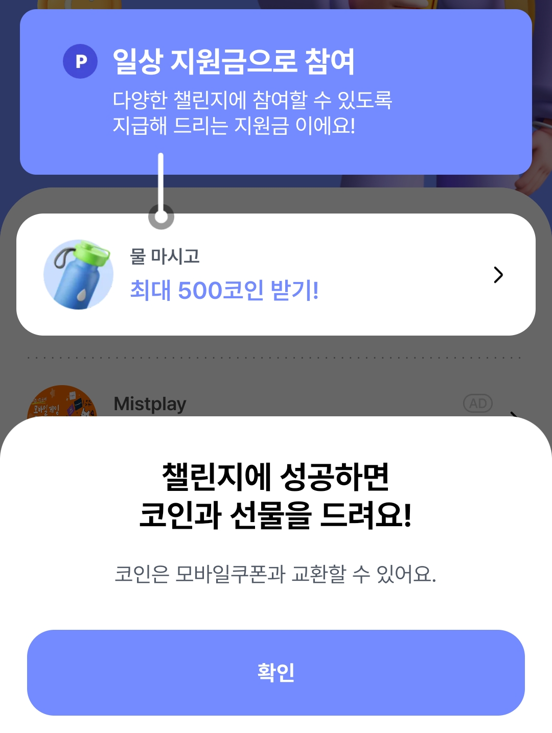 코인을 획득하는 방법은 위에서 언급했던 것처럼 다양한 챌린지로 획득할 수 있습니다. 1,000보는 얼마 안 되기 때문에 바로 참여할 수 있겠죠? 영양제를 먹는 것도, 12시 전에 일어나는 것도 평소에 하던 일들이기 때문에 이로 인해 포인트까지 얻는다면 기분이 좋을 것 같습니다.