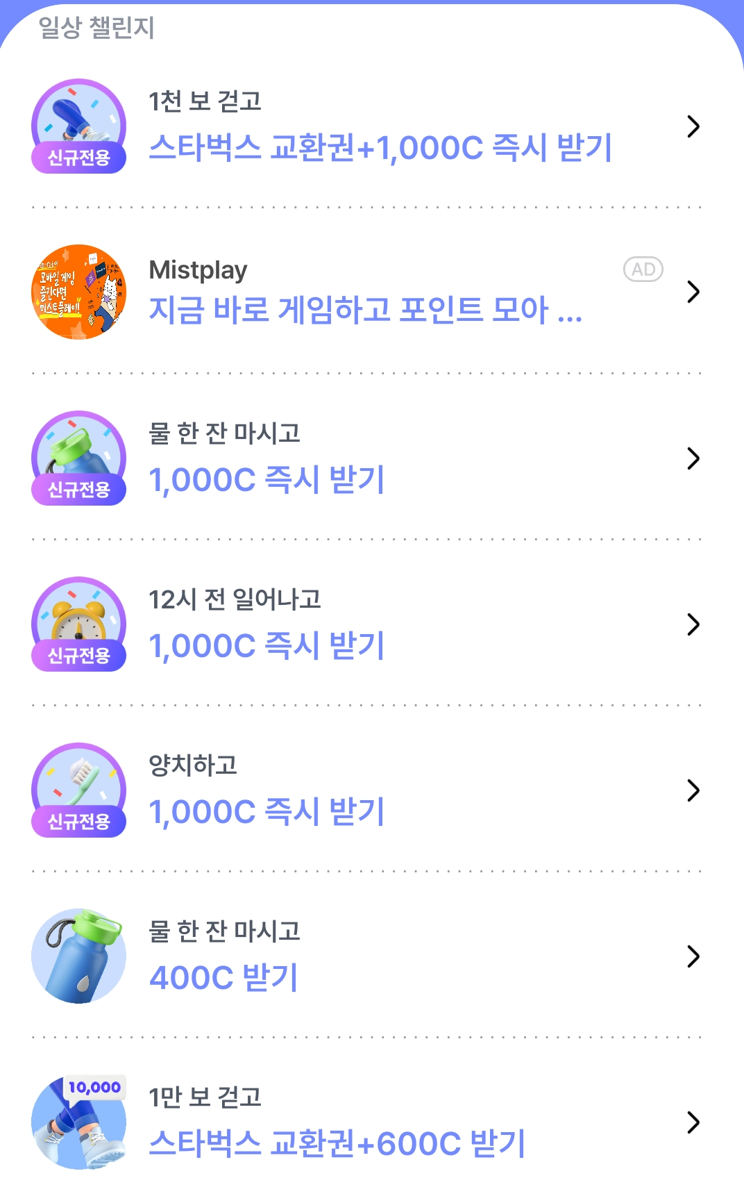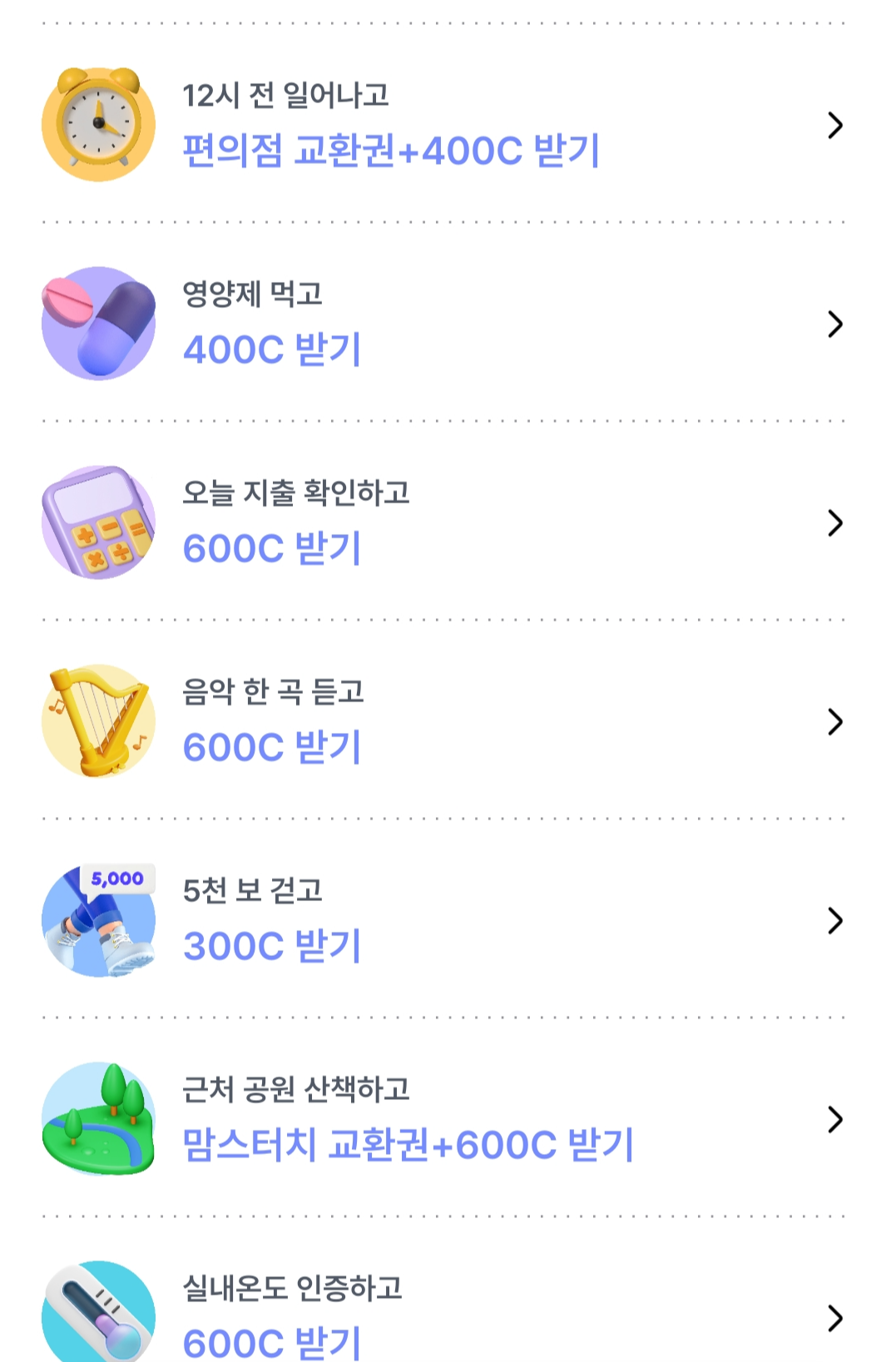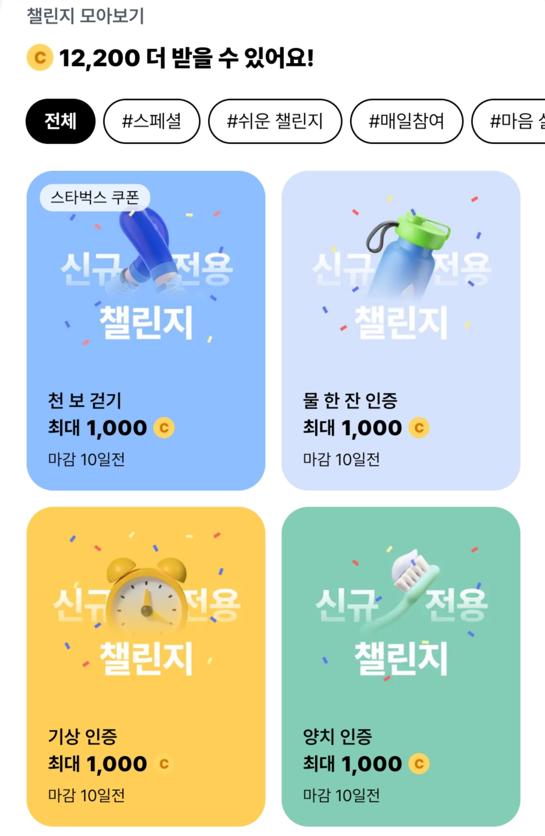 우리는 챌린지를 통해 최대 12,200C를더 벌 수 있습니다. 사진에 나와있는 것처럼 천 보 걷기, 물 한 잔 마신 것 인증하기, 기상 인증하기, 양치 인증하기 같은 일상생활에서 매일 하는 행위들을 통해서 한 건당 최대 1,000원을 받을 수 있습니다.