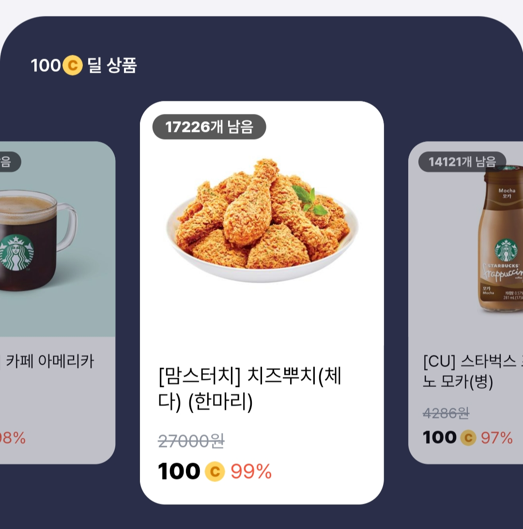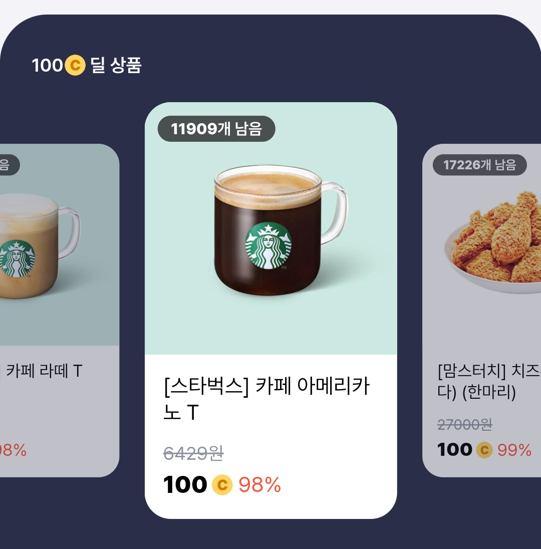 또한 100C 이벤트에 참여해서 스타벅스 아메리카노를 100C에 구매할 수도 있습니다. 스타벅스 카페라떼, 맘스터치 치킨 등 다양한 기프티콘이 있으니 구매해서 꼭 알뜰한 살림살이 챙기셨으면 좋겠습니다.