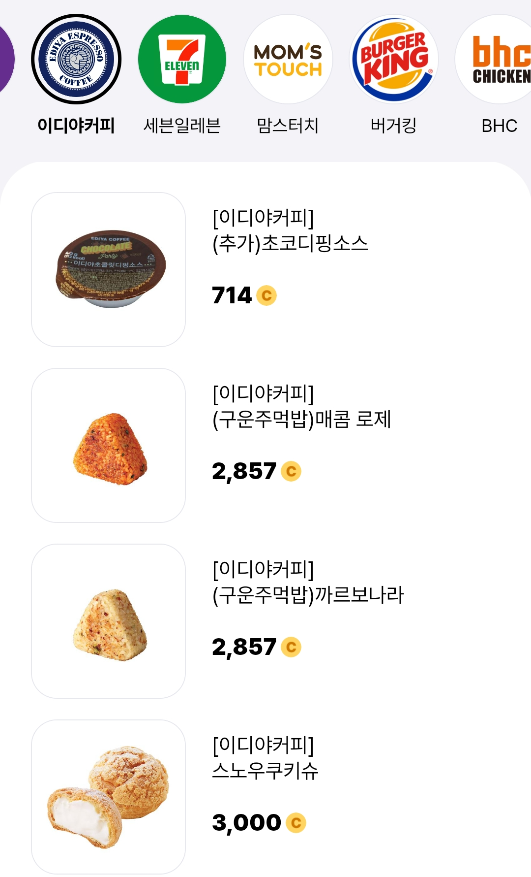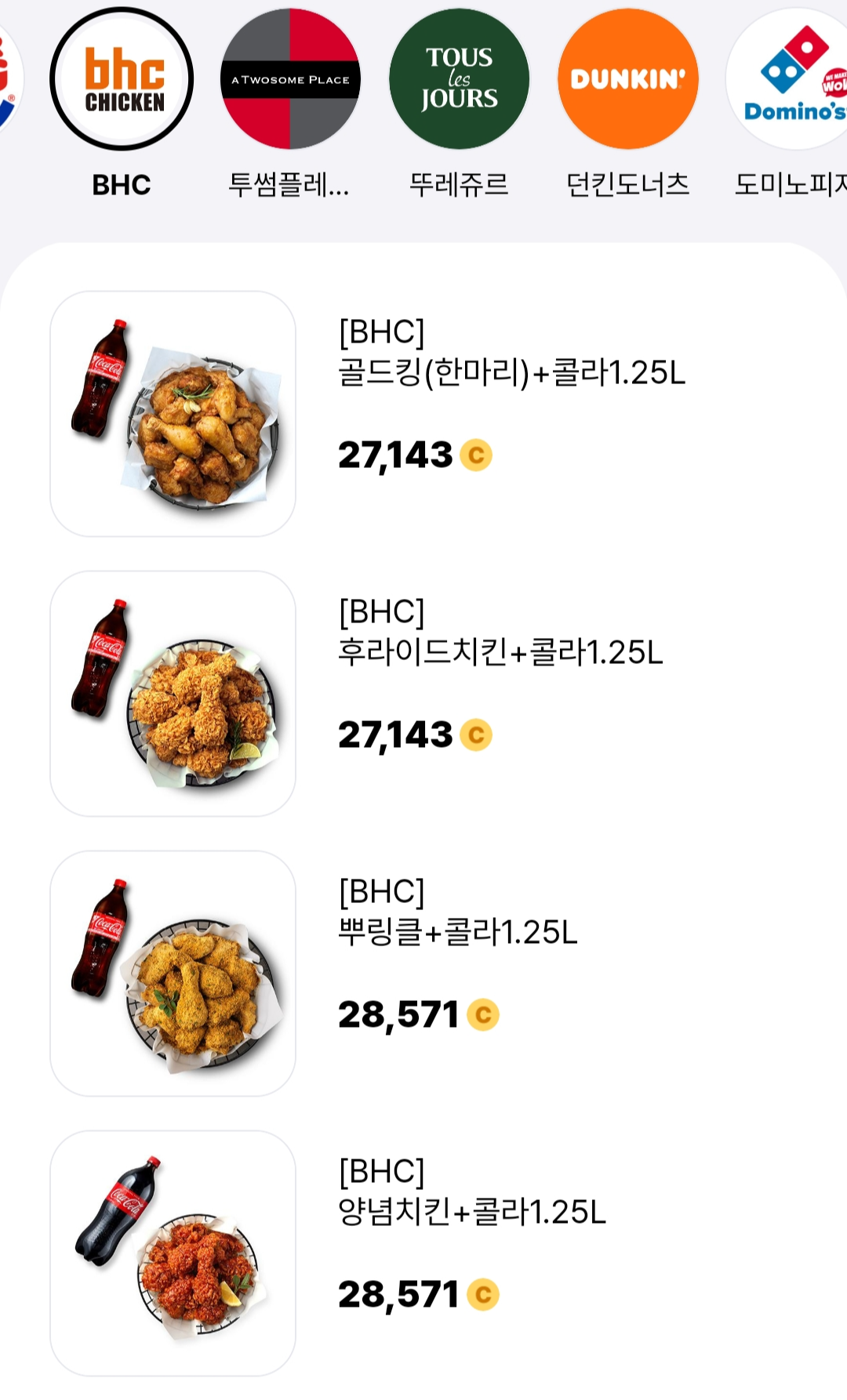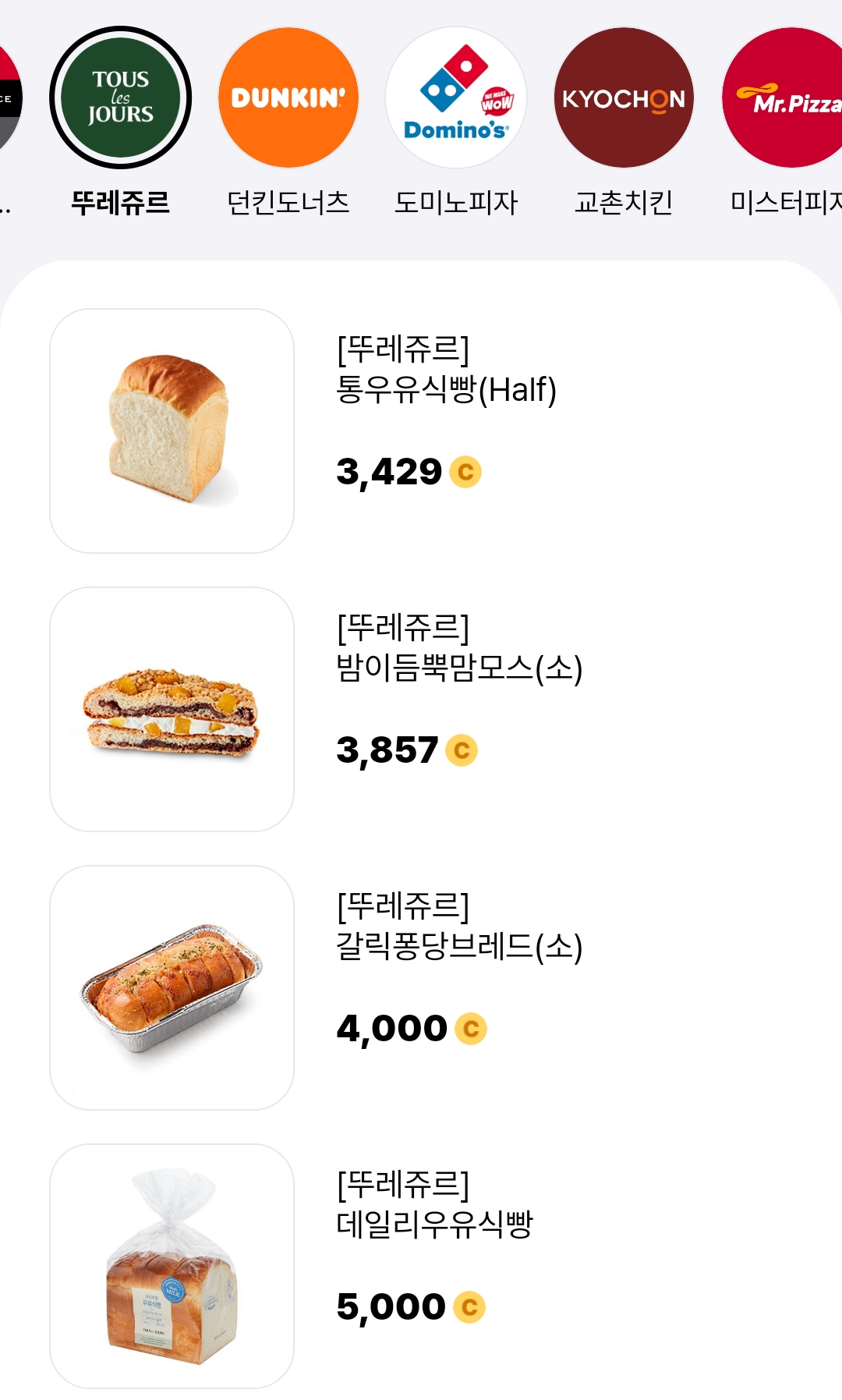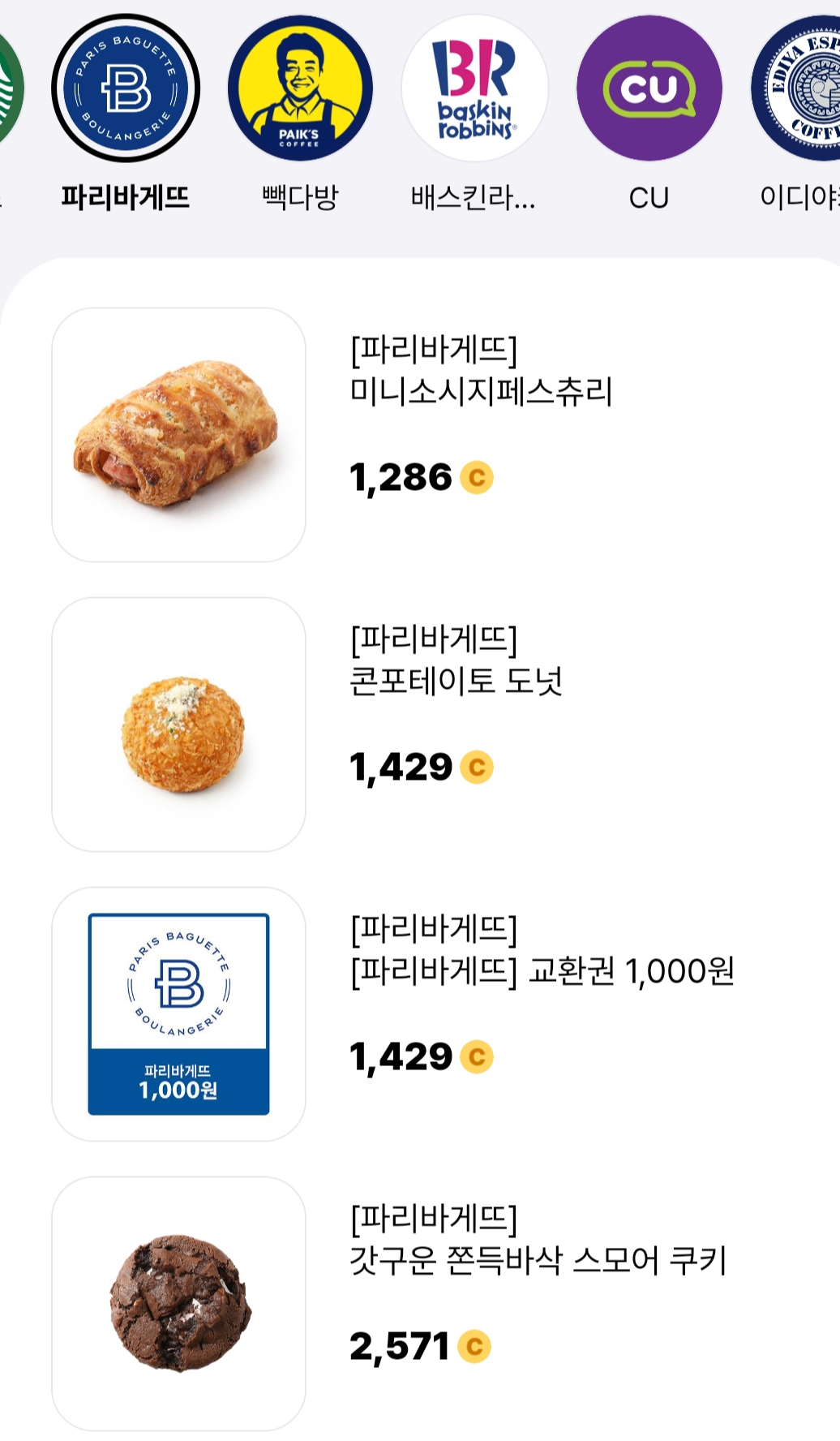위의 이미지처럼 뚜레쥬르, 치킨, 편의점, 배스킨라빈스, 파리바게트, 백다방 등 다양한 곳의 쿠폰을 구매할 수 있습니다.