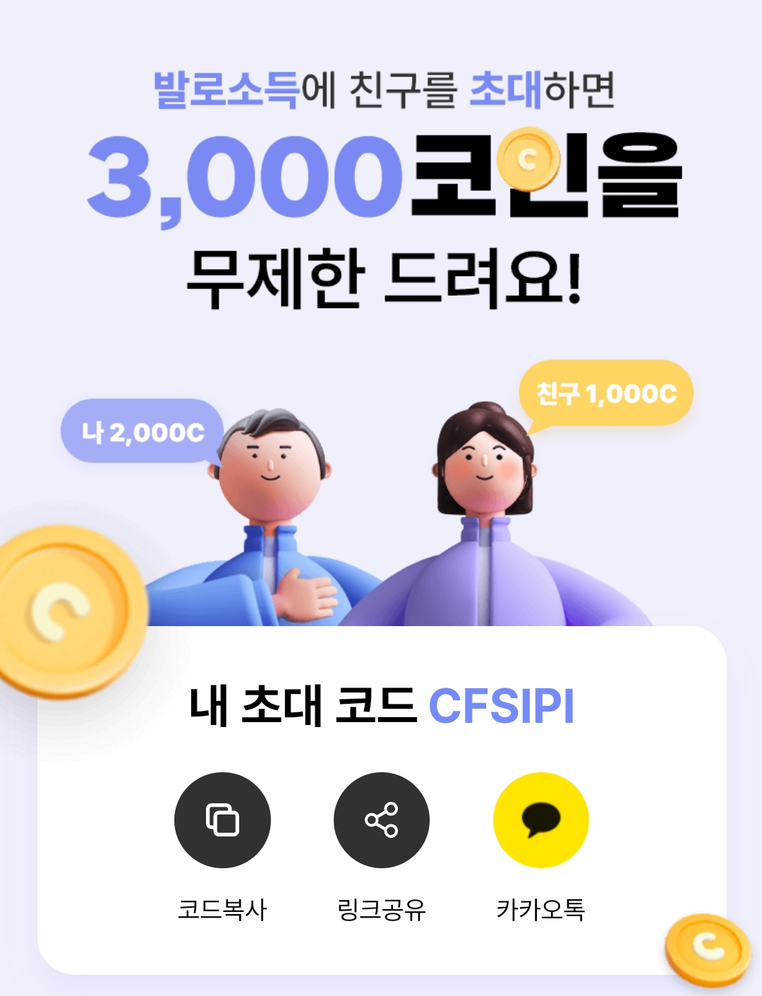 친구를 초대하면 초대할 때마다 2,000 코인을 받을 수 있습니다.