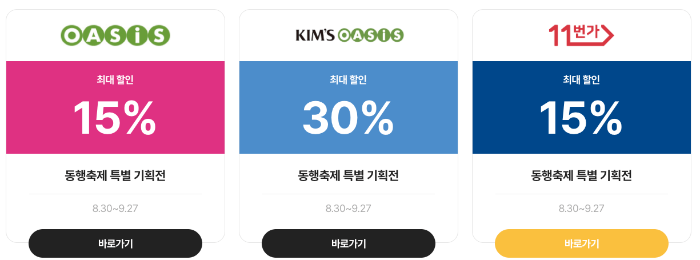 이런식으로 업체마다 할인 쿠폰을 받을 수 있고 해당 사이트로 이동하면 할인 품목이 있거나, 장바구니 쿠폰 20%, 30% 짜리를 받을 수 있습니다. 추석 연휴 지나기 전에 꼭 확인하시고 추석 물품이든 올리브유든 옷이든 필요한 거 있으면 할인받고 구매하시기 바랍니다.