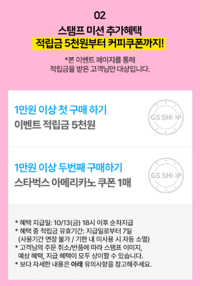 GS SHOP 아이디 조회하시고 조건에 해당하시면 바로 룰렛돌리시면 됩니다. 49,000원 할인 쿠폰 당첨되시면 좋겠습니다. 그리고 두번째 이벤트가 추가로 있는데요 만원이상 첫번째 구매, 두번째 구매 할 경우 적립금 5천원과 스타벅스 아메리카노 쿠폰을 준다고 합니다. 어짜피 49,000원 할인 쿠폰 당첨되서 구매하면 이건 저절로 따라오는거라 안할 이유가 없네요. 이번 GS SHOP 선착순 할인 쿠폰 진짜 대박입니다.