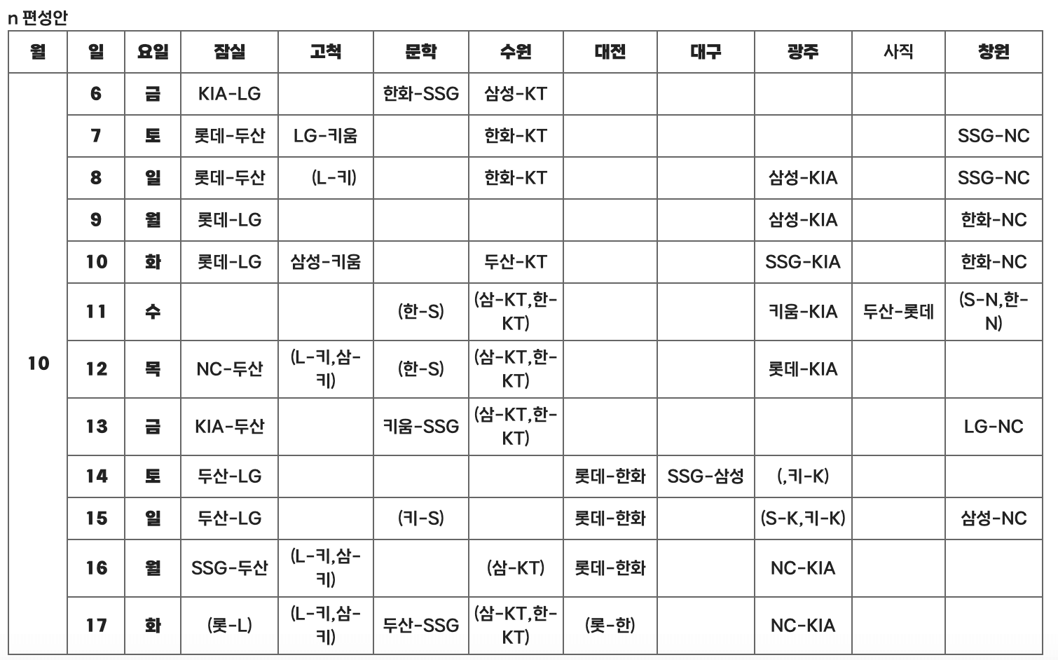 참고로 원래 계획했던 프로야구 정규시즌 종료일은 10월 10일이었습니다. 그렇기 때문에 일주일 미뤄진 상황입니다.