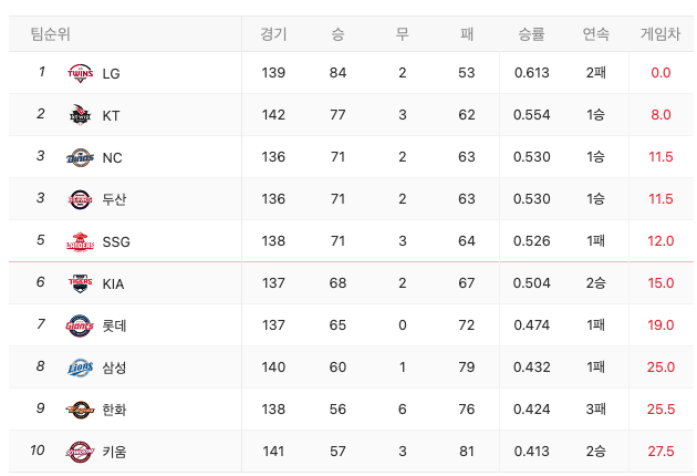 3위를 쟁취하는 팀이 휴식 기간을 충분히 가지고 준플레이오프에 참가할 수 있기 때문에 무조건 3위를 차지하는 것이 유리합니다. SSG의 경우 한창 상위권이었는데 언제 이만큼 추락하게 된 걸까요. 그래도 요즘 추세가 나쁘지 않기 때문에 아직까지 희망이 있다고 봅니다.